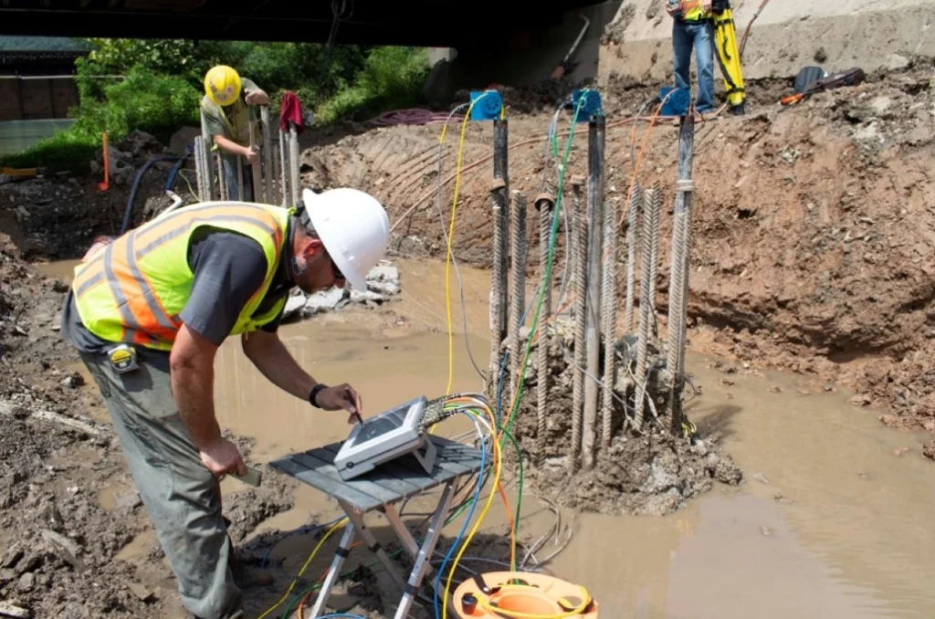 Technicians install access tubes inside drilled shafts or bored piles, then transmit ultrasonic pulses between the tubes. Data collected from the pulses is analyzed to identify any anomalies within the concrete.